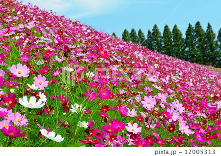 在宮崎縣小林市的生駒高原,在霧島山腳下的高原,秋天的波斯菊和其他時令花開。
