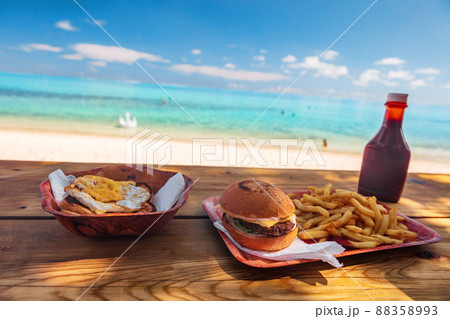 Beach fast food restaurant shake shack bar view of burger and french fries on table with view of ocean in Bora Bora, Tahiti. Polynesia island travel