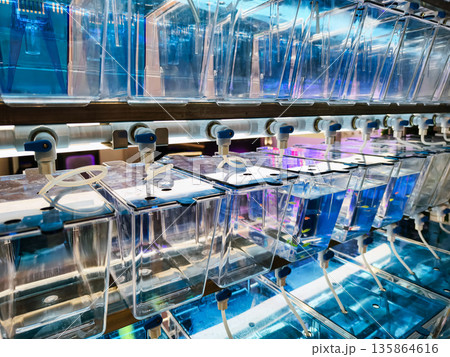 Fish breeding aquariums lined in a row with clear tanks and water filtration systems during daytime hours