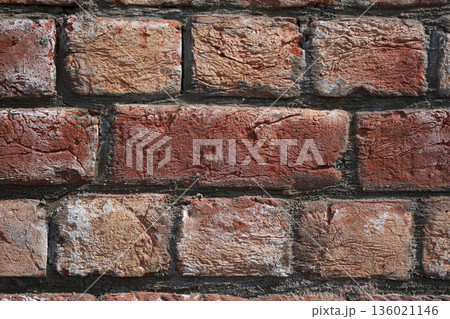Brick wall. Close-up of a fresh brickwork. The red, hand-made uneven bricks, with visible clay layers and a rough texture, were neatly laid in cement mortar in South Asia.