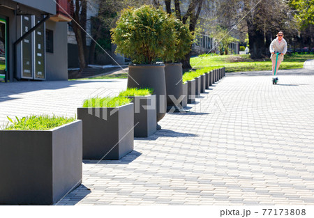 A beautiful sidewalk path decorated with concrete street vases with green grass and bushes is flooded with sunlight.