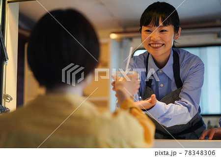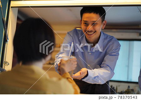 父母和孩子喝從廚房卡車買來的香蕉汁