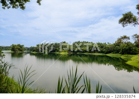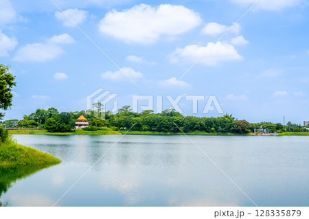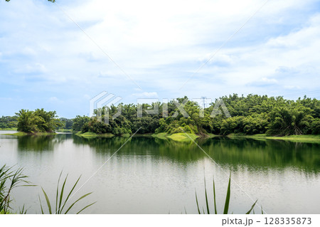 2025年台灣嘉義市。清晨,蘭潭水庫波光粼粼,樹木茂密。