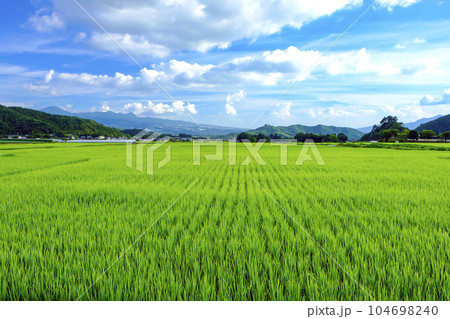 岡山縣北部的盛夏綠色稻田和中國山脈
