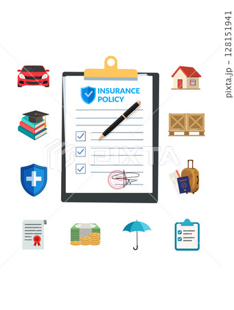 Insurance policy on clipboard with pen isolated on white background. Stock illustration