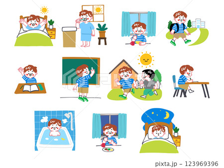 小學男孩一天的活動圖:早上起床到晚上睡覺