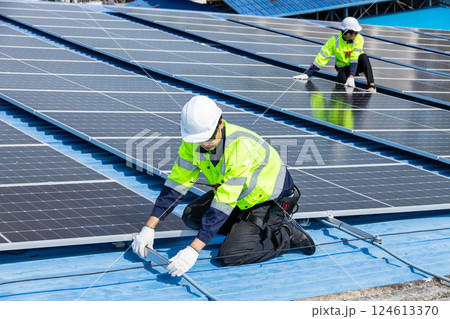 Professional Engineer Service Solar Panel. Worker Maintenance Cleaning Replacing Solar Panel. Solar photovoltaic panel system in Industry roof. Saving Energy with Clean Power.