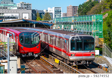 日本的東京城市景觀丸之內線新火車2000系列離開四谷站的視圖