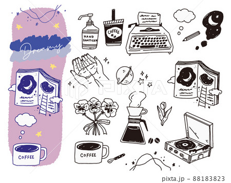 黑白、單調、線條畫插圖(手寫、時尚、時尚、空間、打字機、咖啡)