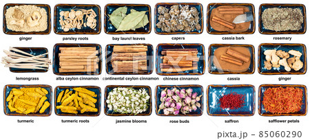 set of various dried flavorings in bowl with names