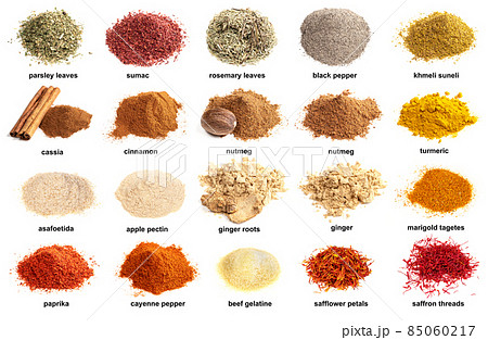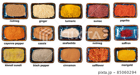 set of piles on powdered spices with names cutout