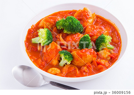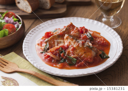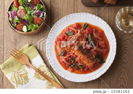 番茄醬燉雞翅佐麵包的西式餐桌圖片