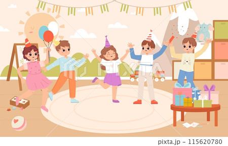 Celebrating birthday in kindergarten. Happy children in playroom with balloons and confetti. Party with gifts, toddlers celebrate cartoon vector scene