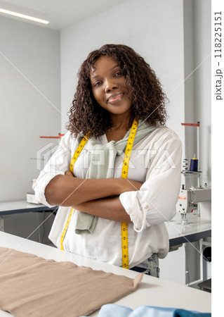 Smiling young dressmaker woman sews clothes on a sewing machine in her workshop