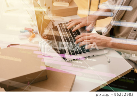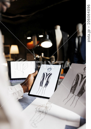 Couturer looking for inspiration for upcoming bespoke comissioned exquisite dress, comparing handdrawn sketch with online outfit. Tailor analyzing designs of fashion attire in tailoring studio