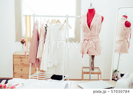 Sewing workshop, custom clothing. Fashion designer is making a model. Fashion house, textile factory