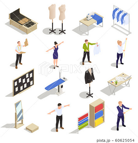 Flat illustration of atelier, sewer take measurements of dress on huge mannequin, sewing workshop