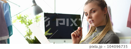 Designer woman thinking at variant of tailor dress pattern, sewer with dotted line sketch at paper