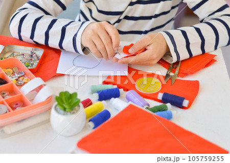 A Caucasian boy of 9 years old is learning to sew with his hands a homemade gift for mom for a holiday.