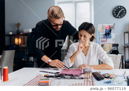 Man and woman designers are discussing new collection of clothes on digital tablet in workshop