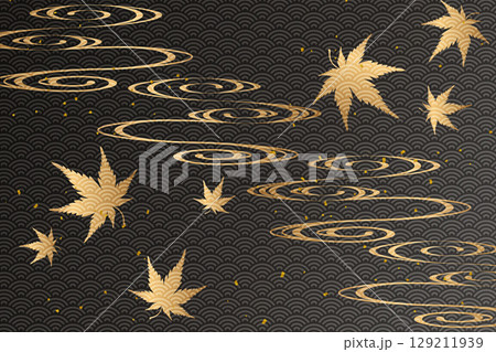 金色楓葉在青外波圖案中翩翩起舞的日式設計 | 楓葉,青外波,金色,日式圖案,秋天,向量