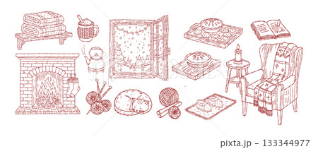 Whimsical christmas holiday winter line hand drawing, sketch doodle decoration set, cozy home, fireplace, armchair, sleeping cat, knitting and window view vector illustration