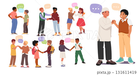 Diverse interracial schoolchildren handshaking gesture and nice communication cartoon scene set