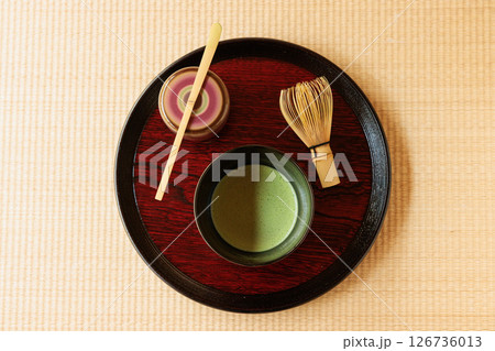 托盤上的抹茶和茶具