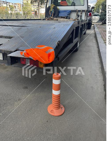 Yellow tow truck loads passenger car and takes to repair shop or impound lot. Lorry with crane. Vehicle transportation. Breakdown automobile carrier. Transport evacuator. Vector concept