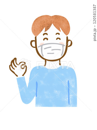 手繪上半身插圖,顯示一名男子戴著面具並做出「OK」手勢