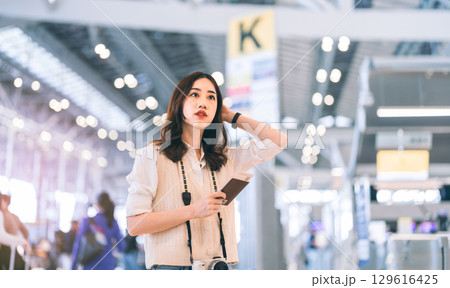Medium shot of standing tourist woman waiting to transit passenger at international airport terminal