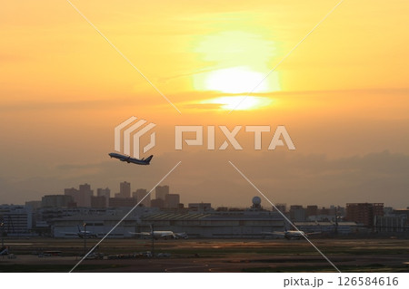 客機在夕陽的襯托下起飛 客機起飛的剪影