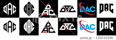 DAC letter logo design in six style. DAC polygon, circle, triangle, hexagon, flat and simple style with black and white color variation letter logo set in one artboard. DAC minimalist and classic logo