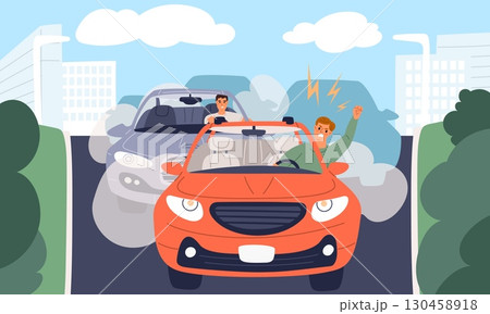 Angry male driver behaves aggressively in car stuck in traffic jam. People conflict. Abuse shouts from automobiles. City transportation. Transport congestion at street. Vector concept