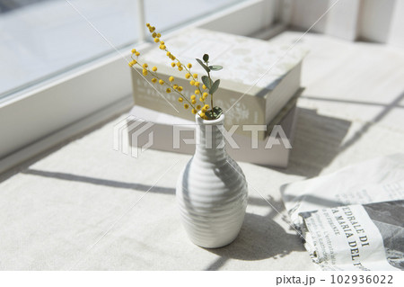 窗台上的白色花瓶、含羞草和桉樹