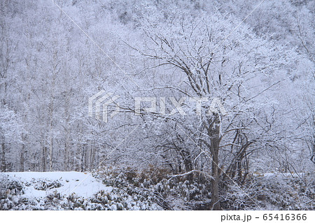 三月北海道美麗山村的雪景,美麗的白雪覆蓋的樹木和乾的虎杖