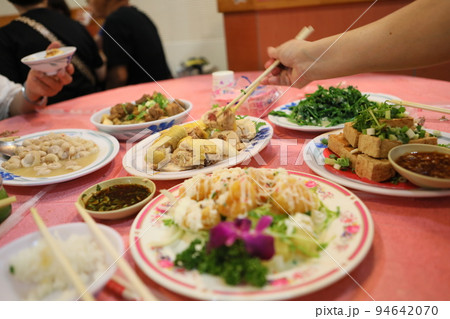 傳統家庭宴會上供應的美食海鮮、肉類和酒杯