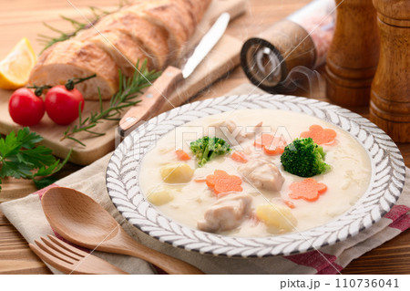 奶油雞肉燉菜和硬麵包卷