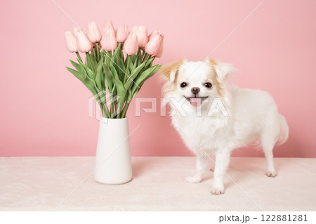 粉紅色包包、鬱金香和一隻微笑的白色吉娃娃