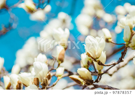 早春陽光明媚的日子,藍天和白玉蘭的白色花蕾