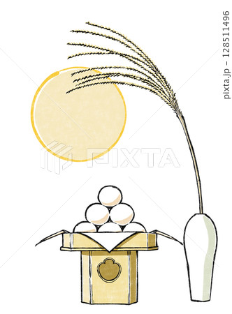 白瓷瓶上懸掛著一輪圓月,瓶身三面擺放著梨子和賞月餃子供品。以毛筆繪製,並以兩種顏色繪製。