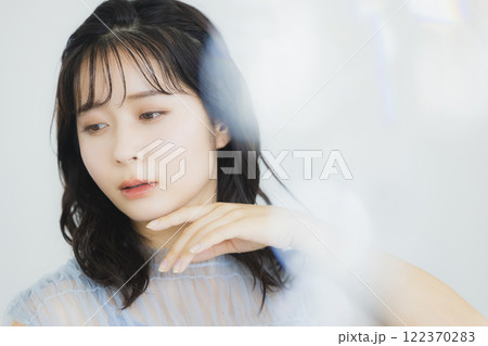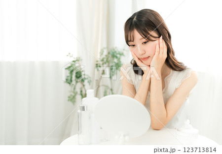 年輕的亞洲女性照鏡子時擔心皮膚問題(皮膚護理)