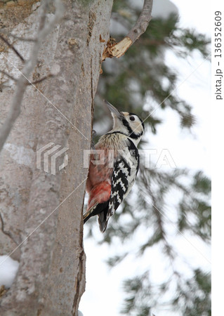 大斑啄木鳥棲息在樹幹上尋找食物