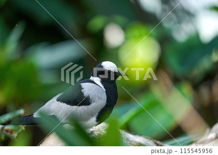 Bali myna, Leucopsar rothschildi, perched on a branch with vibrant green leaves in the background.