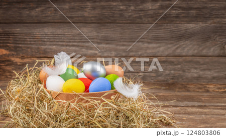 Painted Easter eggs in basket on a wooden table. Happy easter concept. copy space