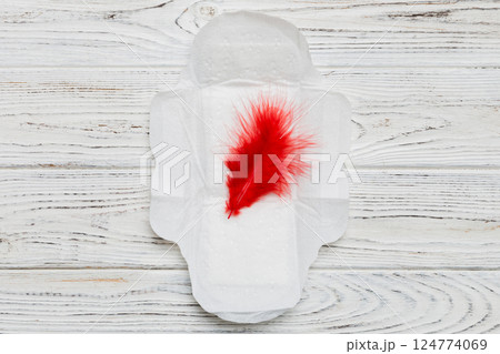 Women hygiene products or Sanitary pad with red feather on colored background. Pastel color. Closeup. Empty place for text. Female daily hygiene
