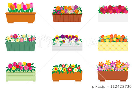 花盆裡色彩繽紛的可愛花朵的插圖集