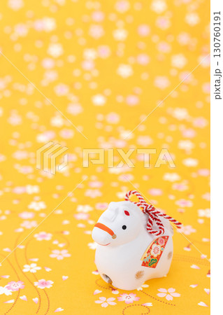 馬年新年素材:紅色背景手持箭矢和梅花花瓣的白馬