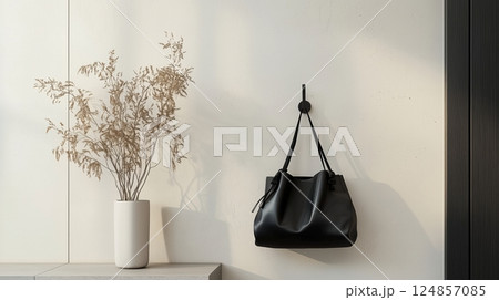 牆上掛著的黑色袋子和白色花瓶的靜物