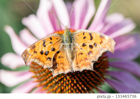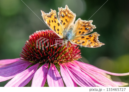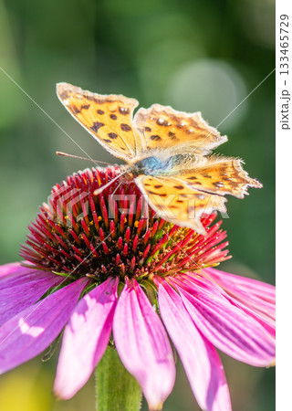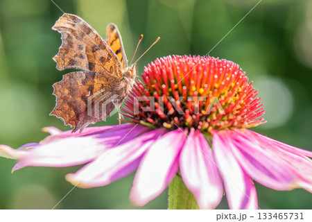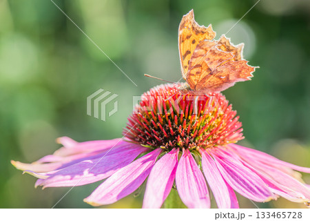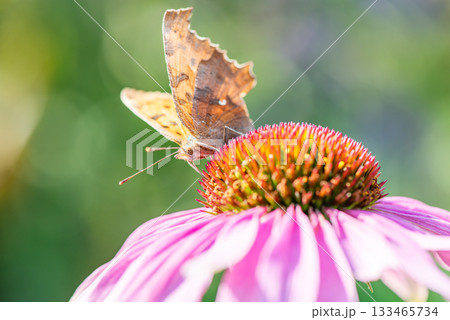一隻北方蝴蝶停在粉紅色的紫錐菊上吸食花蜜。